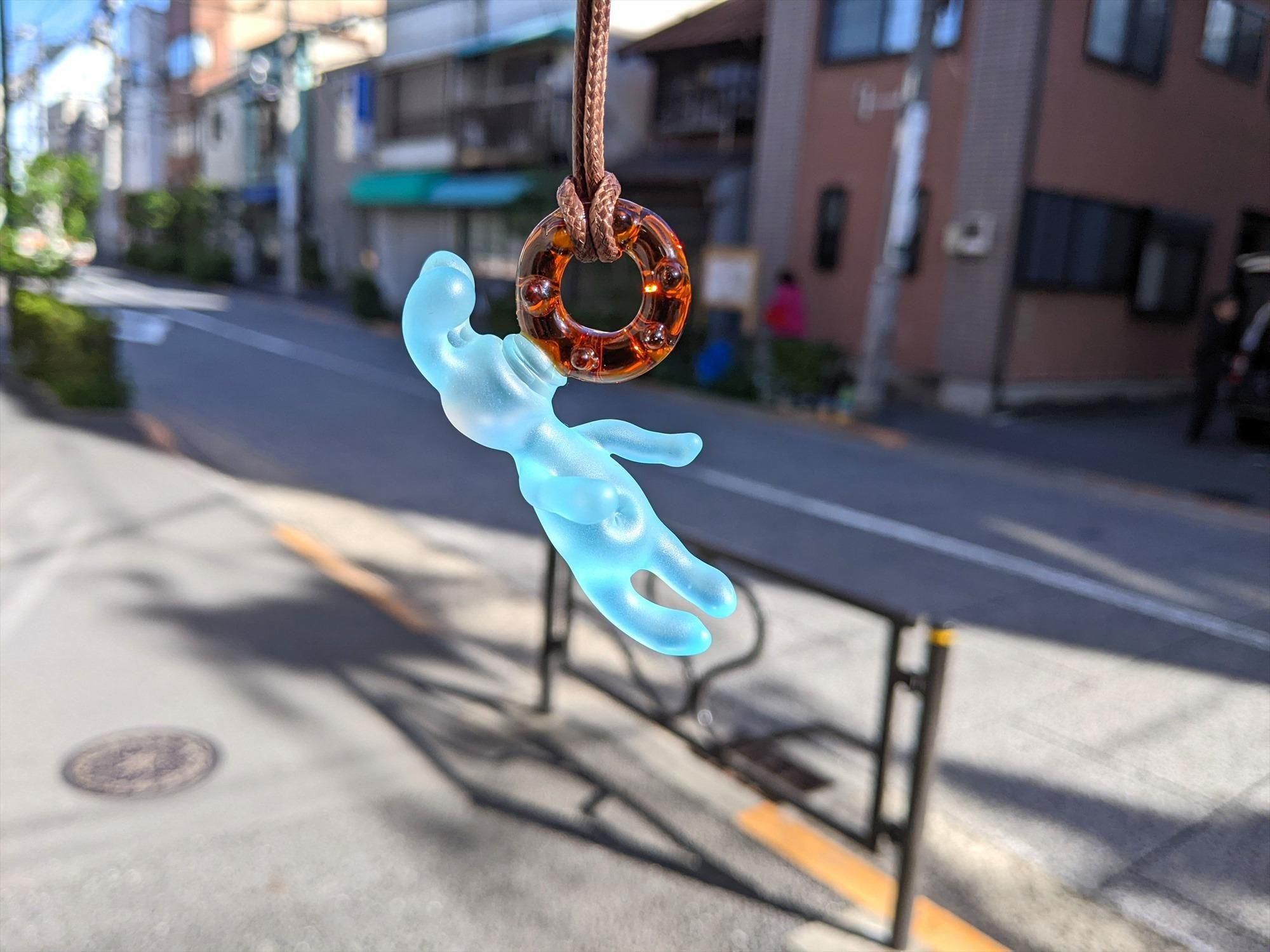 浮き輪のような輪っかがある物が飛んできて、頭にぶつかっている不可抗力を表したペンダントです!