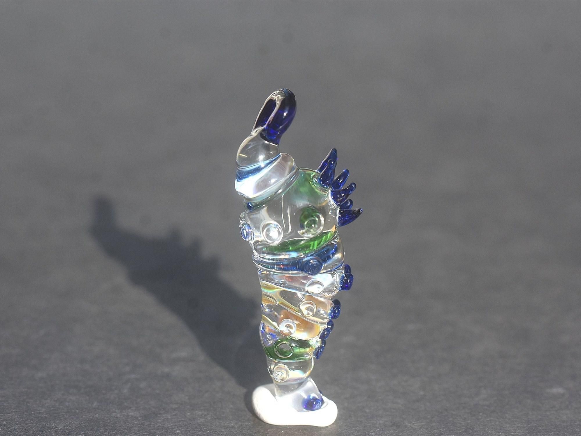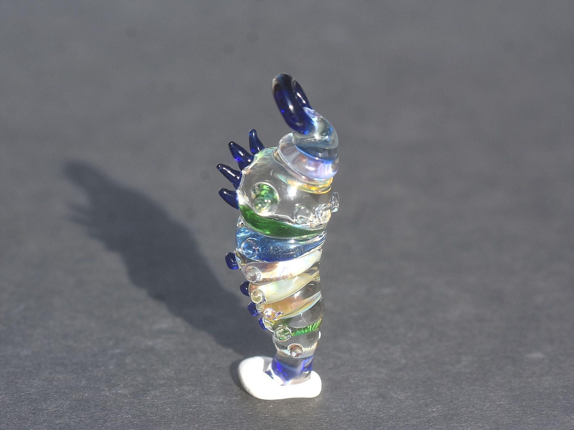 特徴的なサンドブラスト加工をせず、ガラスらしいキラッとして色と透き通る質感を重視したイモムシとなっております☺