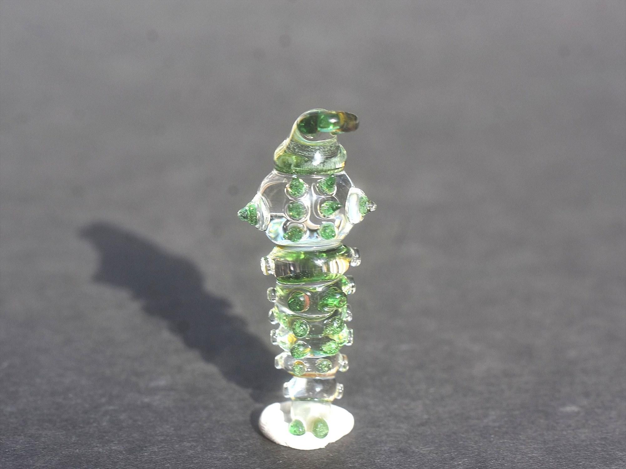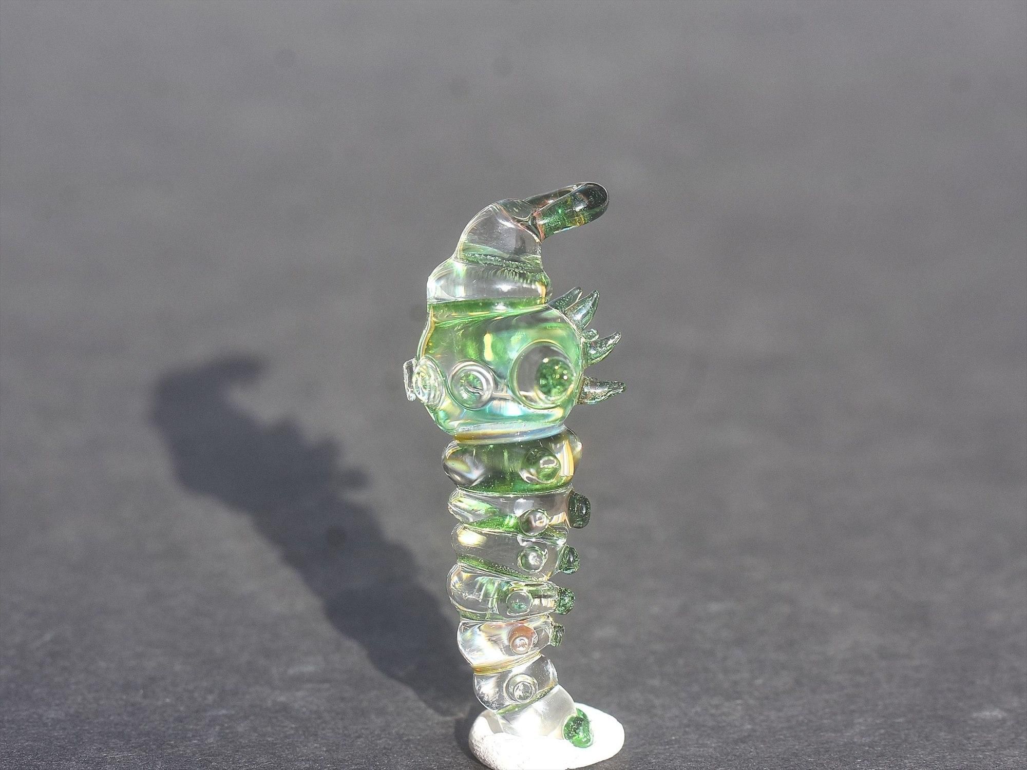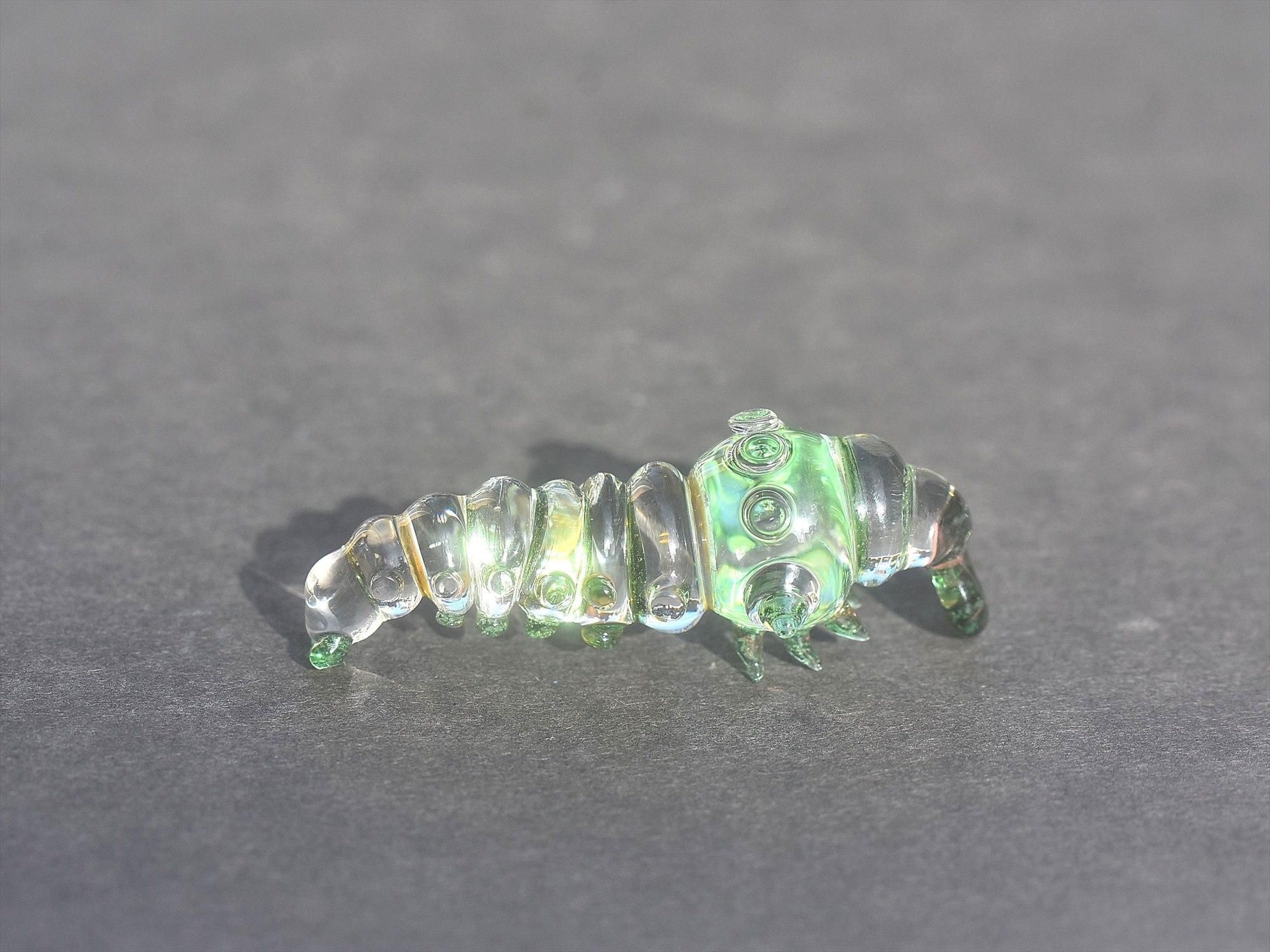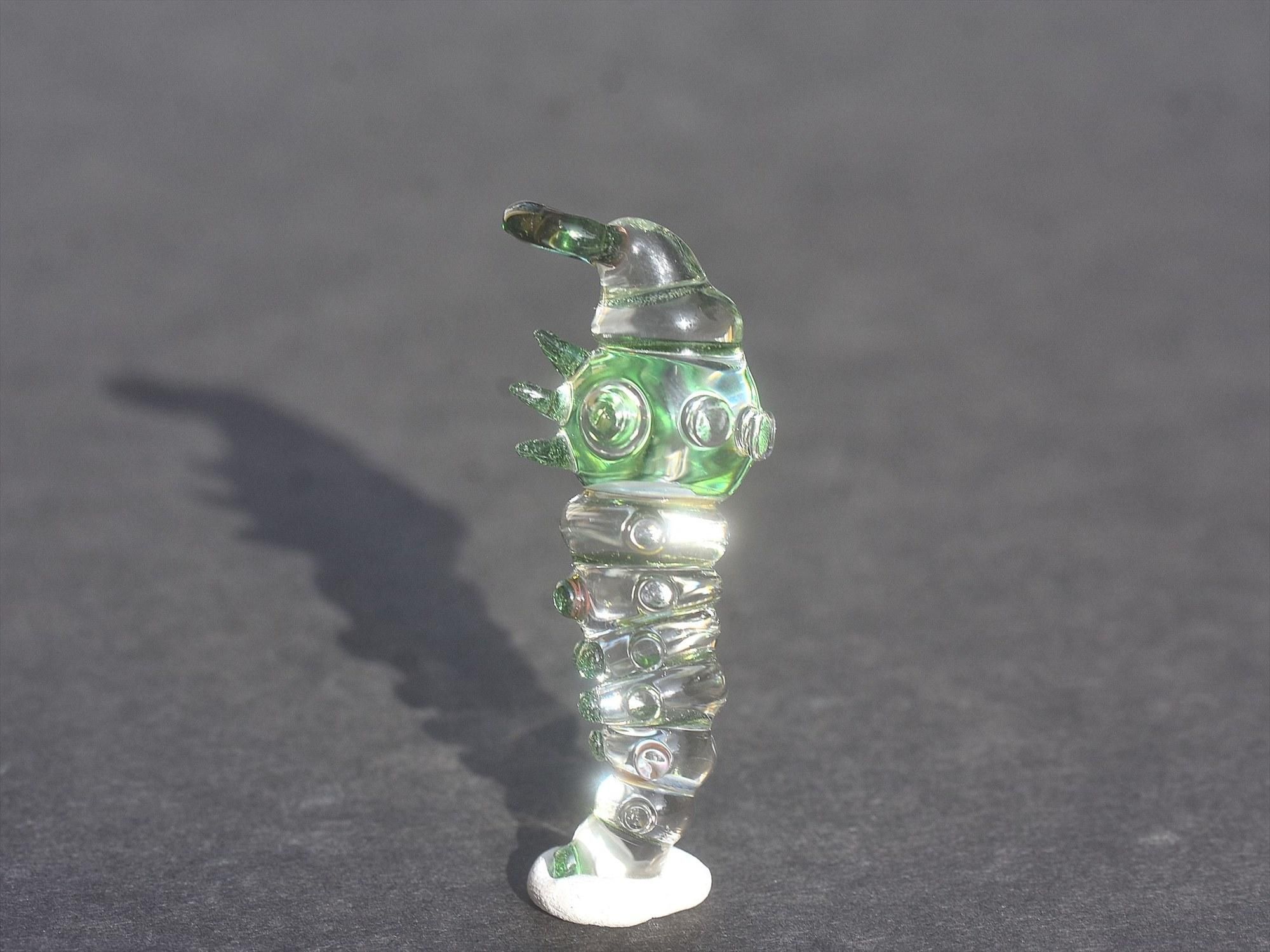 特徴的なサンドブラスト加工をせず、ガラスらしいキラッとして色と透き通る質感を重視したイモムシとなっております☺