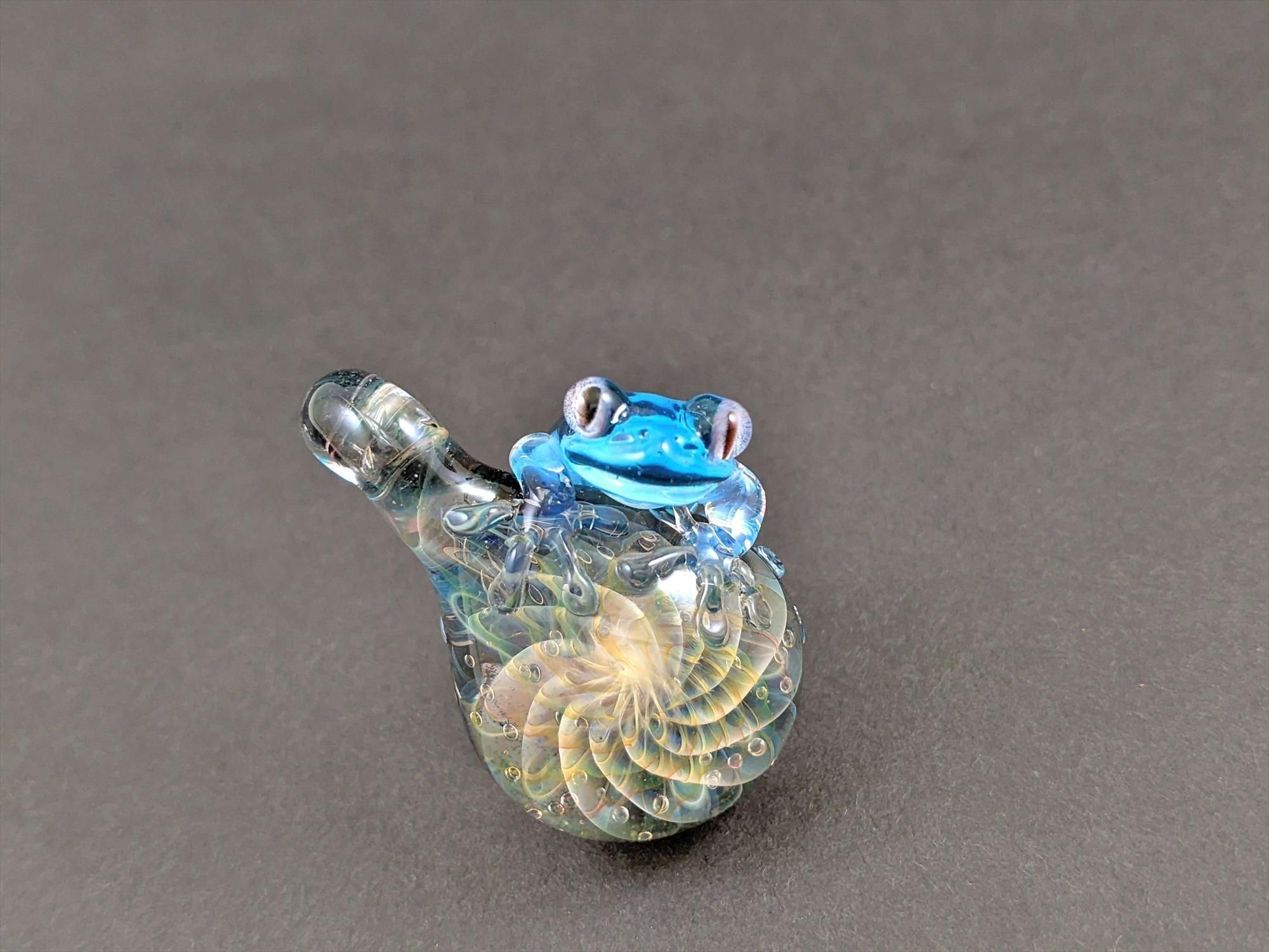 梅雨をイメージしたガラスパーツに乗っているカエルのペンダントです☔🐸