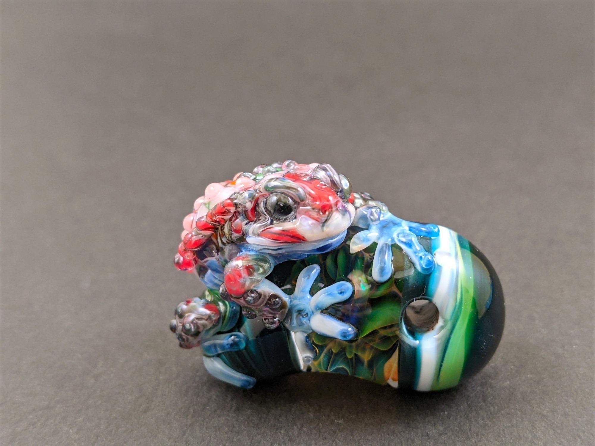 勾玉をイメージしたガラスパーツに乗っているヒキガエルのペンダントです!