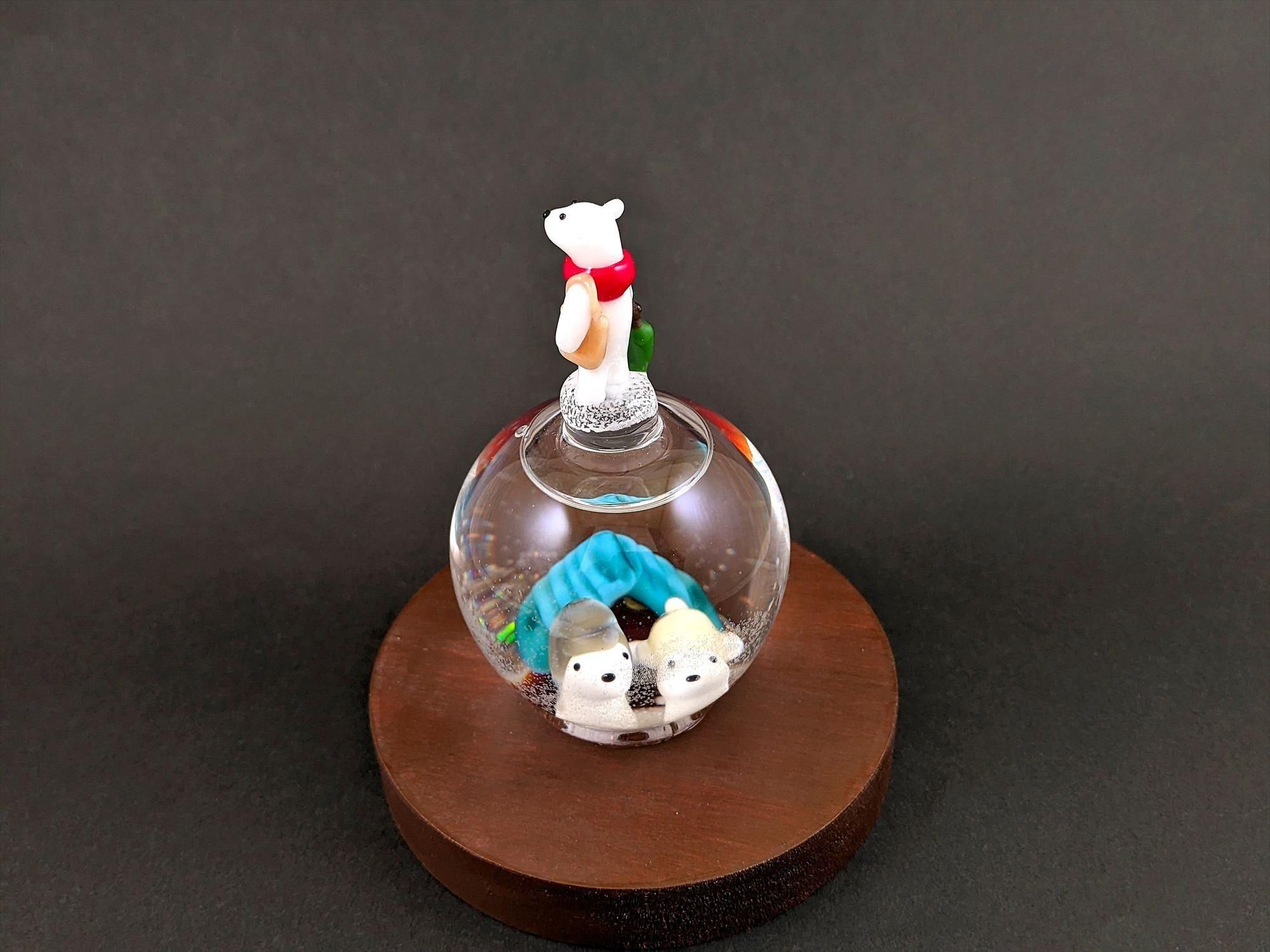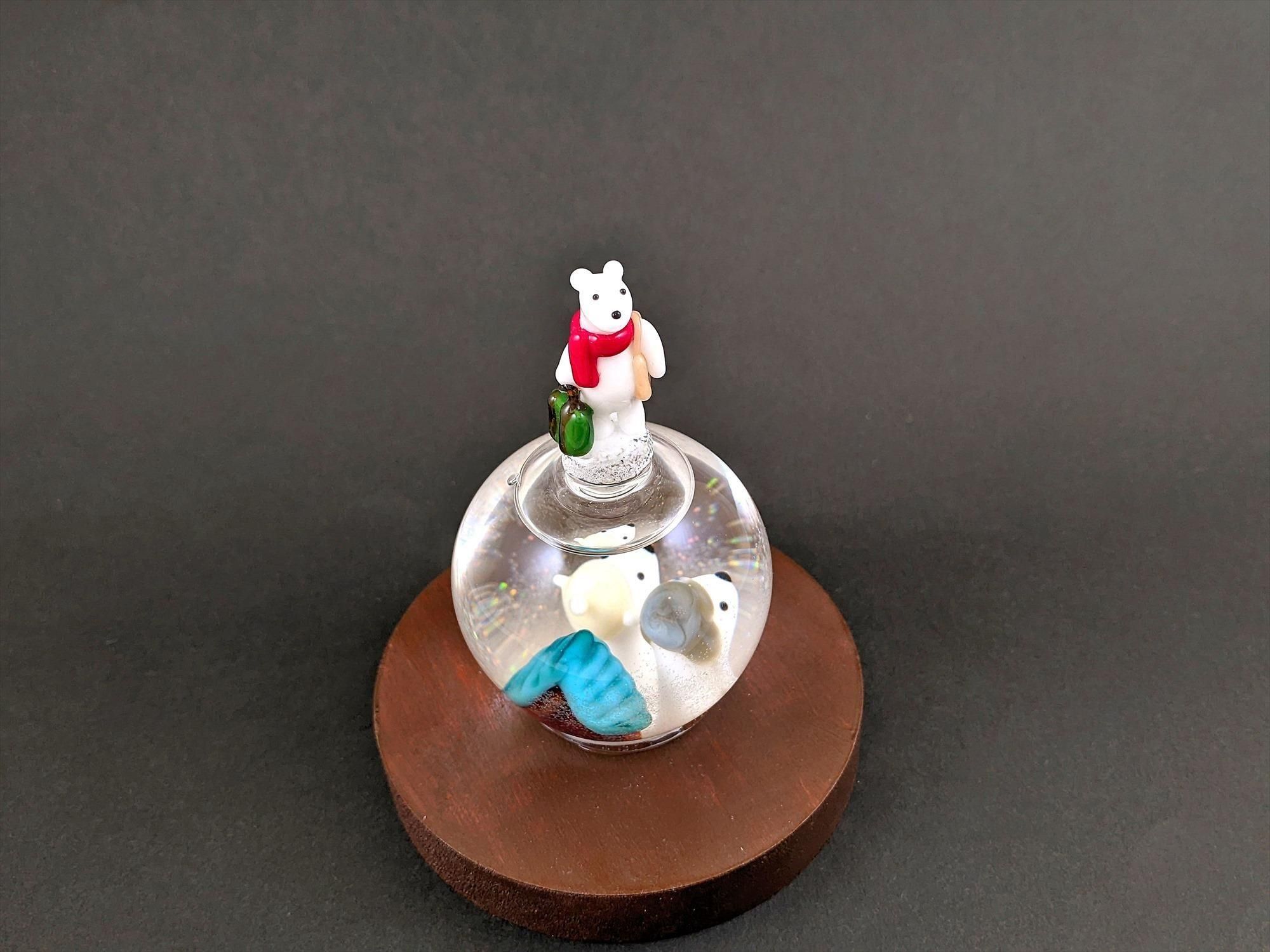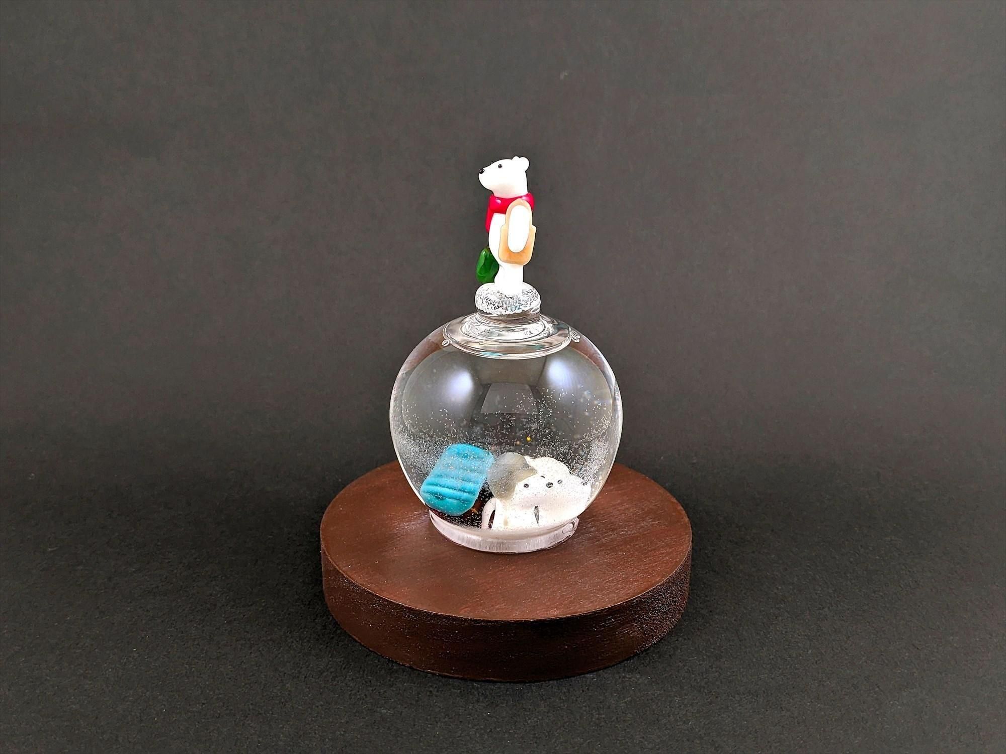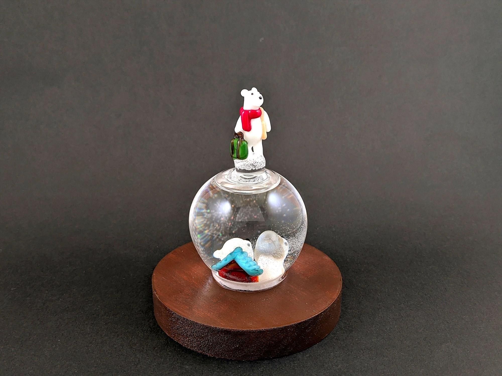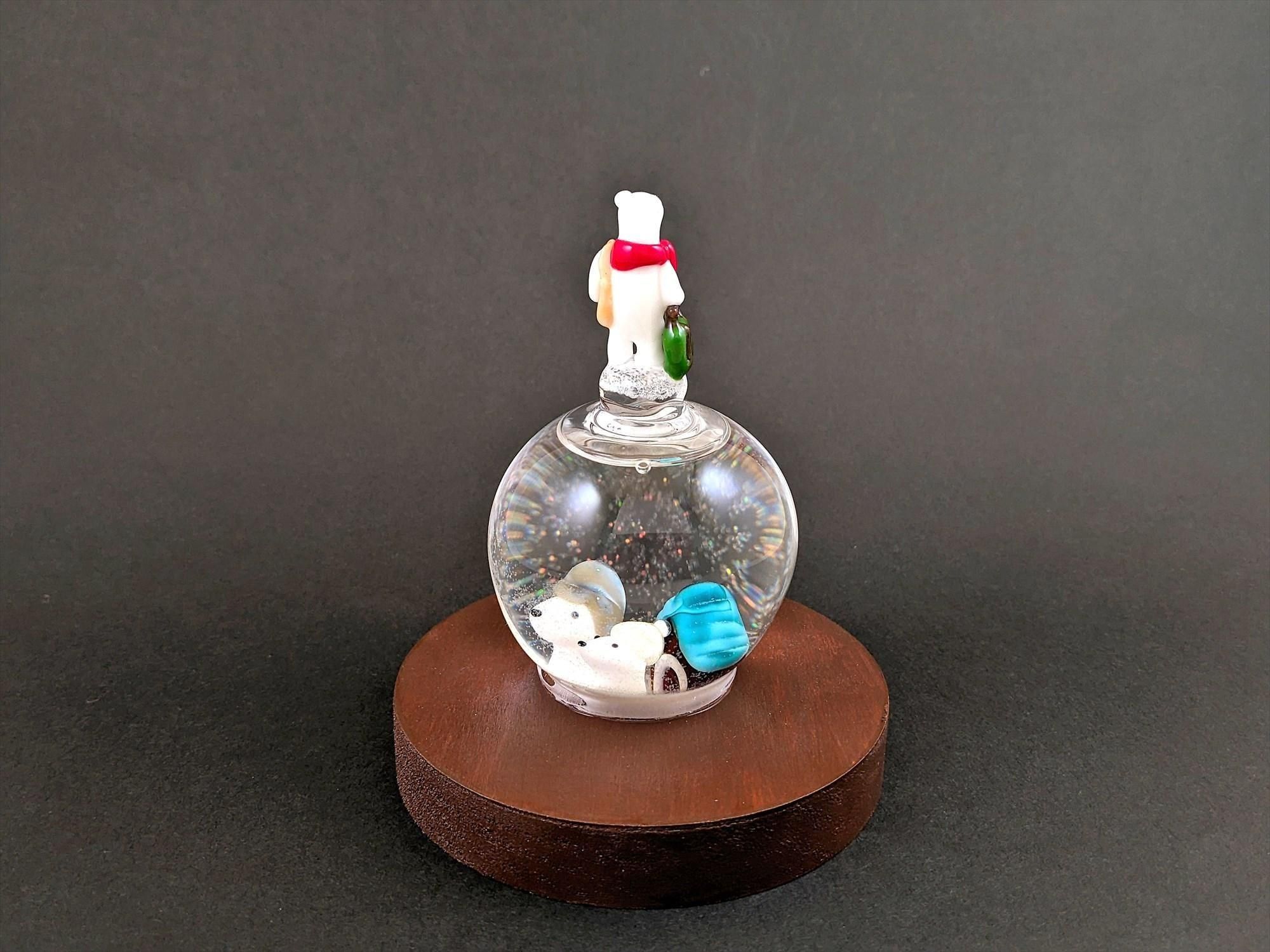 スノードーム用の液体が中に入っており、引っ繰り返すと中の粉状のガラスが舞い、雪景色が楽しめます!